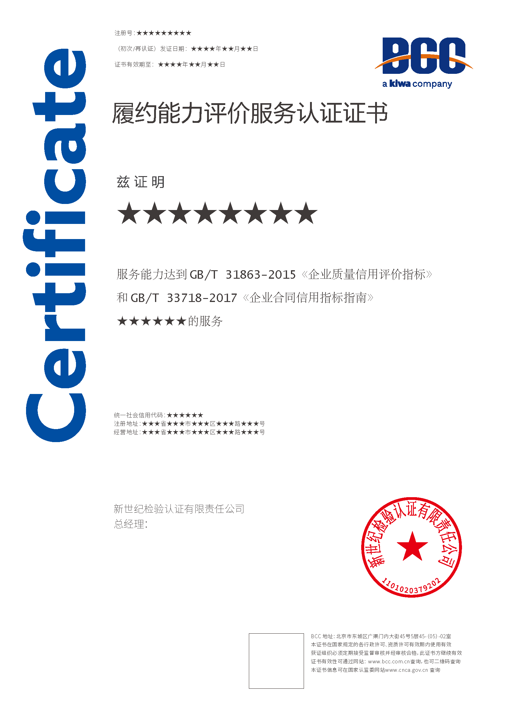 認證依據(jù)為:GB/T 31863-2015 《企業(yè)質(zhì)量信用評價指標》和 GB/T 33718-2017 《企業(yè)合同信用指標指南》。