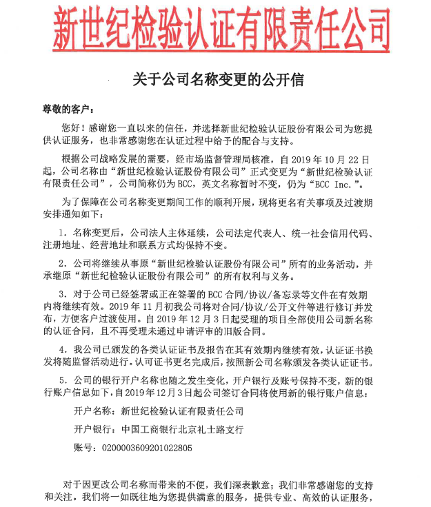 根據(jù)公司戰(zhàn)略發(fā)展的需要,經(jīng)市場監(jiān)督管理局核準(zhǔn),自2019年10月22日起,公司名稱由“新世紀(jì)檢驗認(rèn)證股份有限公司”正式變更為“新世紀(jì)檢驗認(rèn)證有限責(zé)任公司”,公司簡稱仍為BCC,英文名稱暫時不變,仍為“BCC Inc.”。