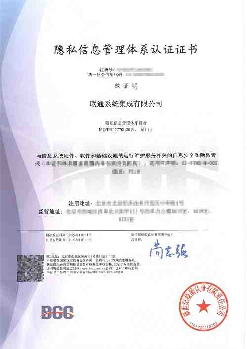 2020年11月13日,聯(lián)通系統(tǒng)集成有限公司(以下簡(jiǎn)稱:聯(lián)通系統(tǒng)集成)順利獲得由新世紀(jì)檢驗(yàn)認(rèn)證有限責(zé)任公司(以下簡(jiǎn)稱:BCC)頒發(fā)的ISO/IEC 27701 隱私信息管理體系認(rèn)證證書。