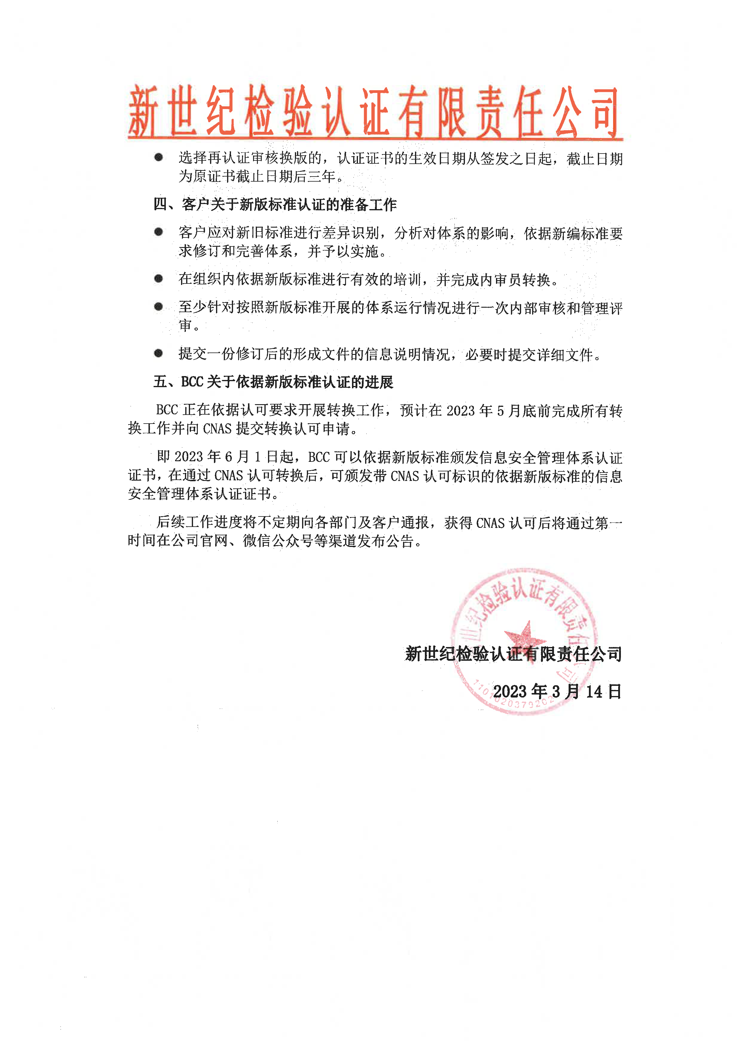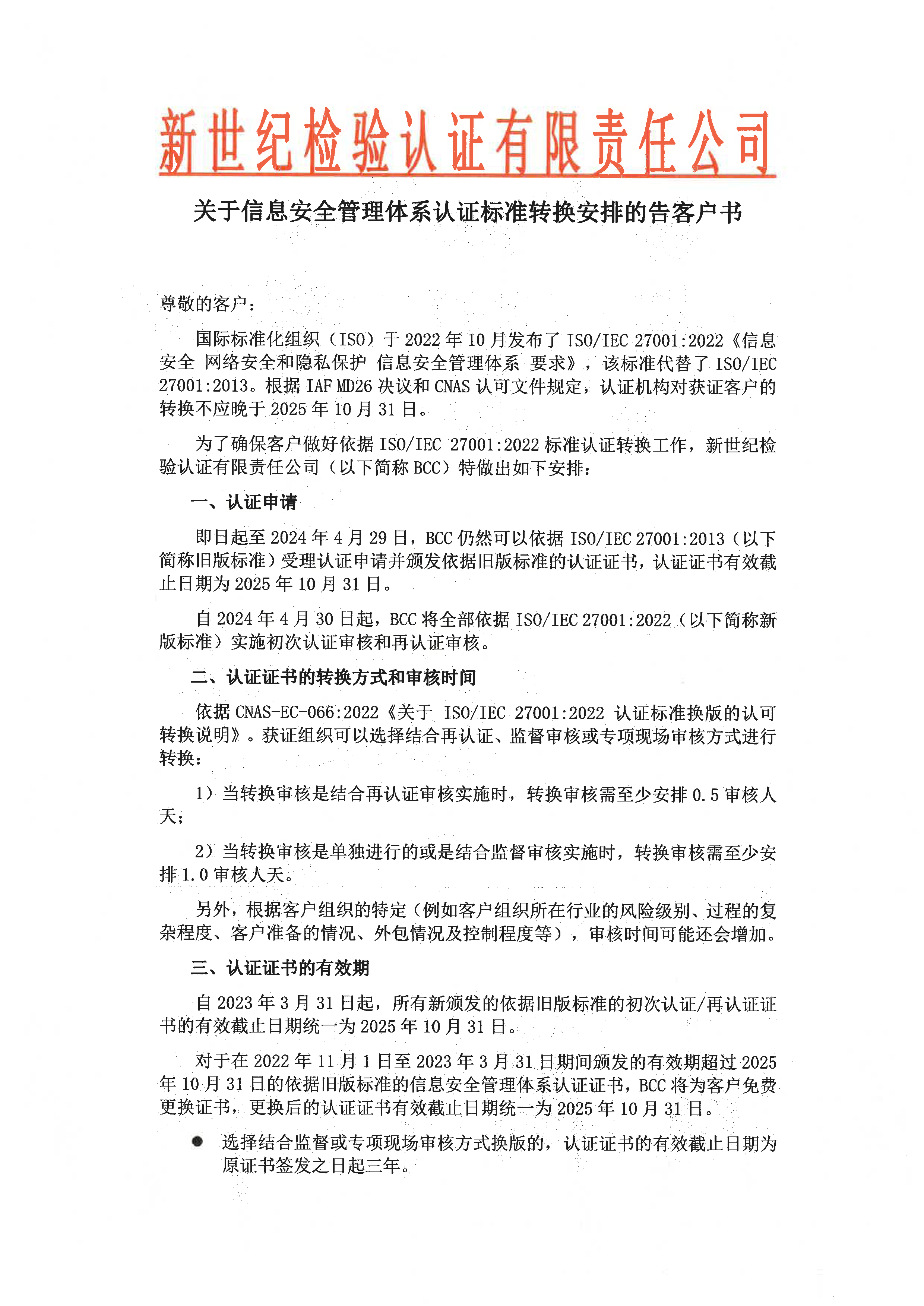 關(guān)于信息安全管理體系認(rèn)證標(biāo)準(zhǔn)轉(zhuǎn)換安排的告客戶書(shū)