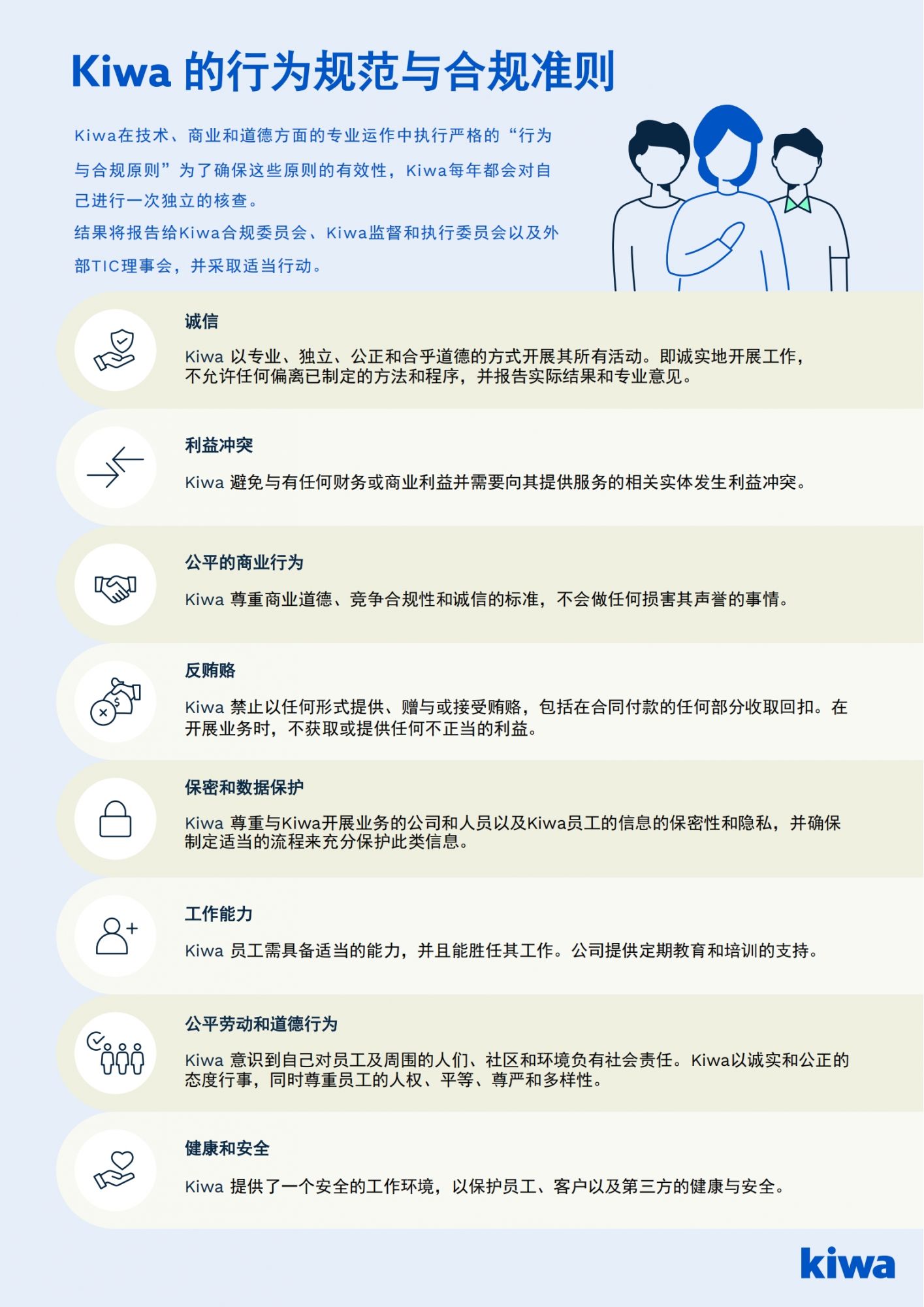 Kiwa致力于實(shí)現(xiàn)最高的道德和誠信標(biāo)準(zhǔn)。這意味著我們希望員工遵守Kiwa的行為和合規(guī)準(zhǔn)則(以及基本的政策框架),并避免做出與我們的價值觀相沖突的商業(yè)決策,即使這些決策在財務(wù)上可能具有吸引力。